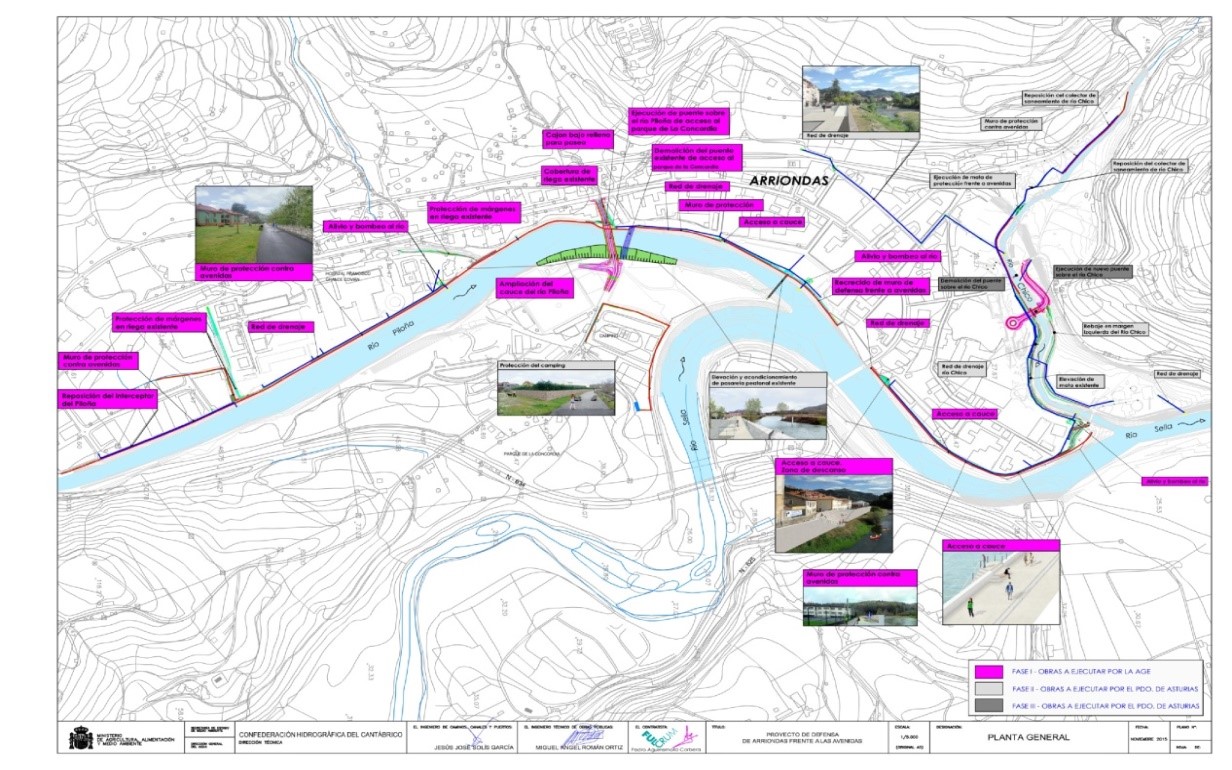 Arriondas uholdeen aurrean babesteko proiektuan sartutako jarduerak. II. fasea: - Eusteko azpiegiturak eraikitzea Chico ibaiaren ertzetan, Sella ibaiarekin bat egiten duen tokian urak gainezka egin ez dezan. Azpiegitura horiek lur naturalen “mota” baten bidez diseinatuta daude. - Euri-urak drainatzeko eta husteko sareak. Chico ibaiaren ondoko hirigunean bildutako prezipitazioak ingurunera ebakuatzeko, proiektuak lurpeko hainbat kanalizazio eraikitzea aurreikusten du, ur horiek benetako hustubideetara eramateko. - Piloña ibaiaren gaineko zaldaina jasotzea. Proiektuan egindako kalkuluen arabera, diseinuko hiribidearen hustuketak azpiegituraren hustubidegaitasun handiagoa eskatzen du, eta, horretarako, proiektuan jasotzen da kota altuago batean berriro instalatzea. - Chico ibaiko saneamendu-kolektorea berritzea. Chico ibaiaren ibilguan babes-obrak egin behar direnez, horri lotuta dagoen saneamendu-kolektorea beste toki batean kokatu behar da. - Babes eta defentsarako zutikako hormen egiterapena. Chico ibaiaren ertzak babesteko beharrak kontuan hartuta, kanpoko baldintzengatik (bide, zerbitzu, etxebizitza eta abarrei eragindako kalteak) lurzoru natural mota bat sartzerik izan ez den zonetan, hormigoi armatuzko hormak proiektatu dira puntualki, gehienez 2,00 m-ko altuerakoak.